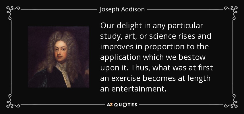 Our delight in any particular study, art, or science rises and improves in proportion to the application which we bestow upon it. Thus, what was at first an exercise becomes at length an entertainment.