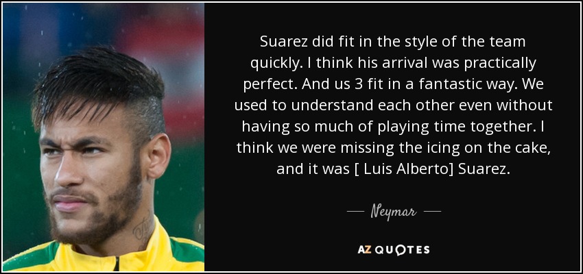 Suarez did fit in the style of the team quickly. I think his arrival was practically perfect. And us 3 fit in a fantastic way. We used to understand each other even without having so much of playing time together. I think we were missing the icing on the cake, and it was [ Luis Alberto] Suarez.
