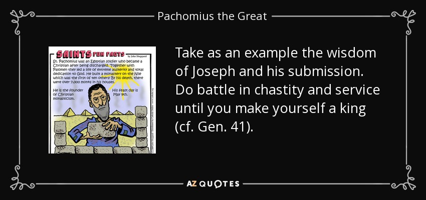 Take as an example the wisdom of Joseph and his submission. Do battle in chastity and service until you make yourself a king (cf. Gen. 41).
