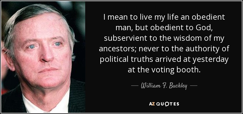 I mean to live my life an obedient man, but obedient to God, subservient to the wisdom of my ancestors; never to the authority of political truths arrived at yesterday at the voting booth.