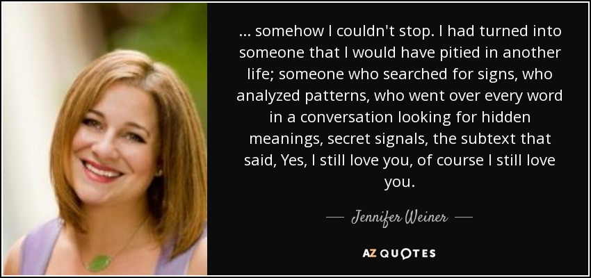 ... somehow I couldn't stop. I had turned into someone that I would have pitied in another life; someone who searched for signs, who analyzed patterns, who went over every word in a conversation looking for hidden meanings, secret signals, the subtext that said, Yes, I still love you, of course I still love you.