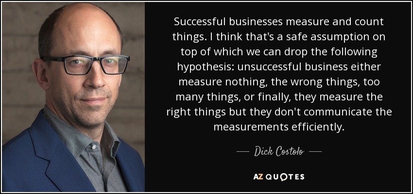 Successful businesses measure and count things. I think that's a safe assumption on top of which we can drop the following hypothesis: unsuccessful business either measure nothing, the wrong things, too many things, or finally, they measure the right things but they don't communicate the measurements efficiently.