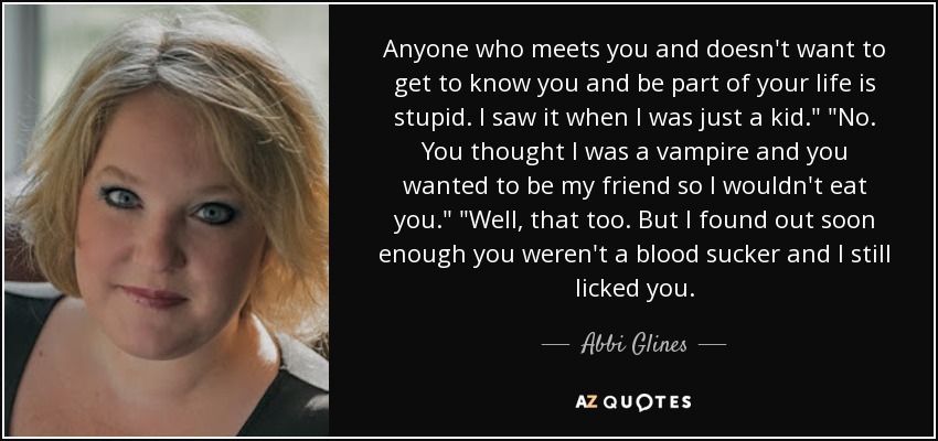 Anyone who meets you and doesn't want to get to know you and be part of your life is stupid. I saw it when I was just a kid." "No. You thought I was a vampire and you wanted to be my friend so I wouldn't eat you." "Well, that too. But I found out soon enough you weren't a blood sucker and I still licked you.