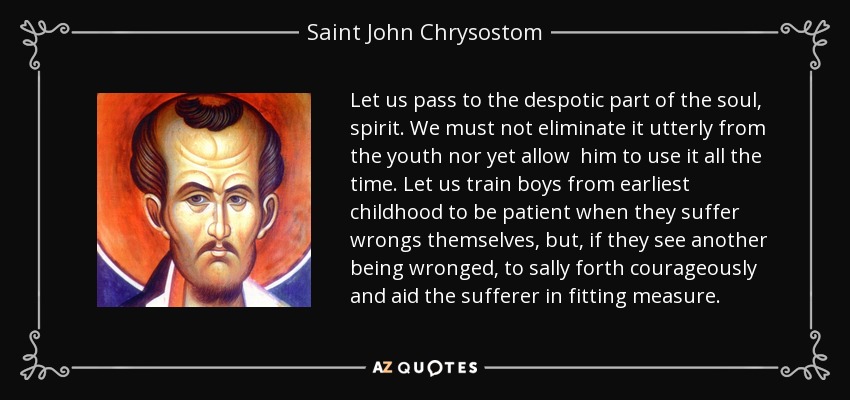 Let us pass to the despotic part of the soul, spirit. We must not eliminate it utterly from the youth nor yet allow him to use it all the time. Let us train boys from earliest childhood to be patient when they suffer wrongs themselves, but, if they see another being wronged, to sally forth courageously and aid the sufferer in fitting measure.