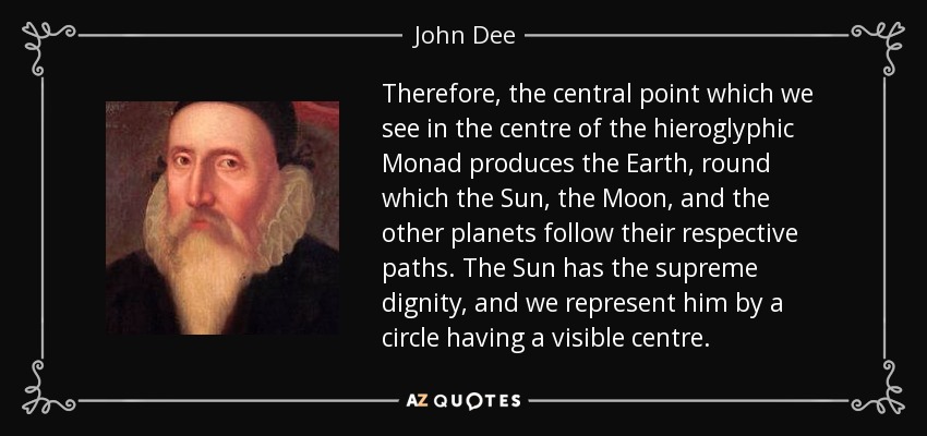 Therefore, the central point which we see in the centre of the hieroglyphic Monad produces the Earth , round which the Sun , the Moon , and the other planets follow their respective paths. The Sun has the supreme dignity , and we represent him by a circle having a visible centre.