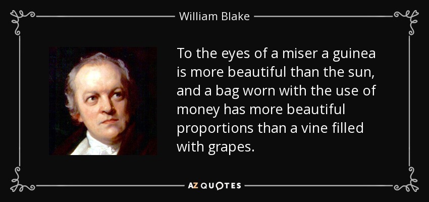 To the eyes of a miser a guinea is more beautiful than the sun, and a bag worn with the use of money has more beautiful proportions than a vine filled with grapes.