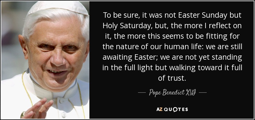 To be sure, it was not Easter Sunday but Holy Saturday, but, the more I reflect on it, the more this seems to be fitting for the nature of our human life: we are still awaiting Easter; we are not yet standing in the full light but walking toward it full of trust.