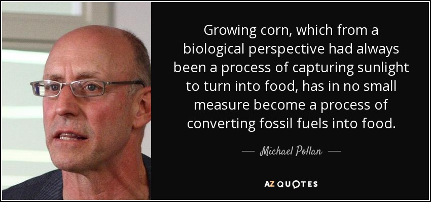 Growing corn, which from a biological perspective had always been a process of capturing sunlight to turn into food, has in no small measure become a process of converting fossil fuels into food.