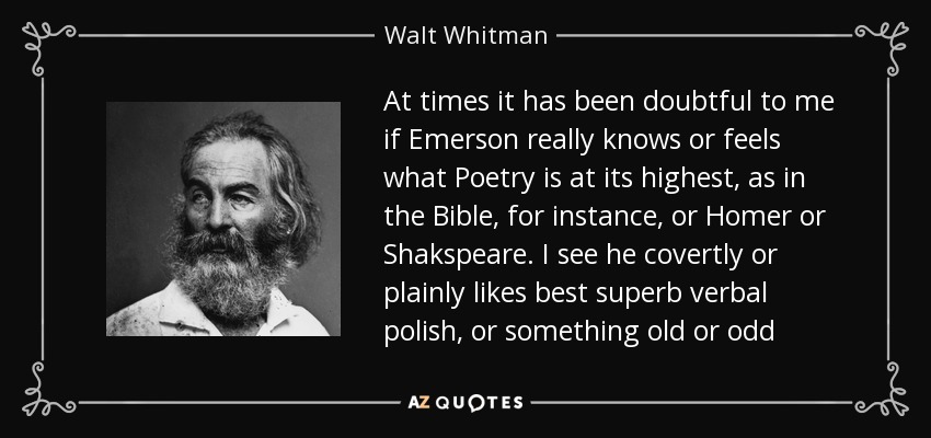 At times it has been doubtful to me if Emerson really knows or feels what Poetry is at its highest, as in the Bible, for instance, or Homer or Shakspeare. I see he covertly or plainly likes best superb verbal polish, or something old or odd