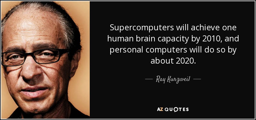 Supercomputers will achieve one human brain capacity by 2010, and personal computers will do so by about 2020.