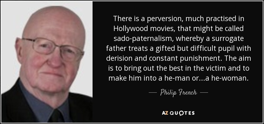 There is a perversion, much practised in Hollywood movies, that might be called sado-paternalism, whereby a surrogate father treats a gifted but difficult pupil with derision and constant punishment. The aim is to bring out the best in the victim and to make him into a he-man or...a he-woman.