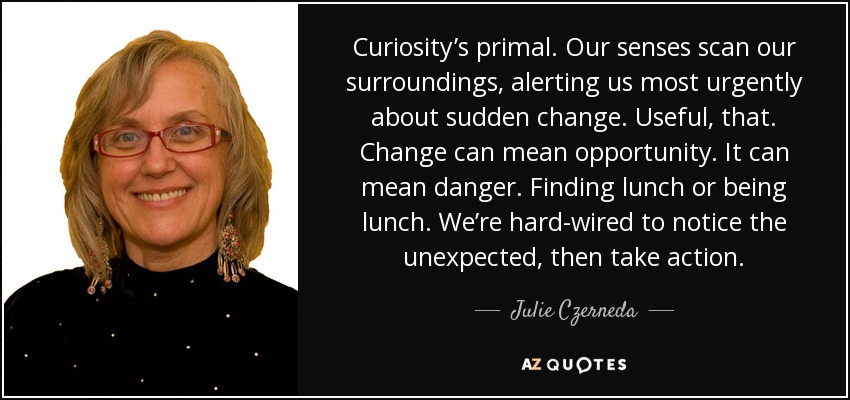 Curiosity’s primal. Our senses scan our surroundings, alerting us most urgently about sudden change. Useful, that. Change can mean opportunity. It can mean danger. Finding lunch or being lunch. We’re hard-wired to notice the unexpected, then take action.