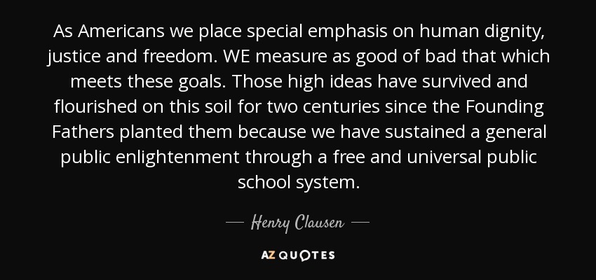 As Americans we place special emphasis on human dignity, justice and freedom. WE measure as good of bad that which meets these goals. Those high ideas have survived and flourished on this soil for two centuries since the Founding Fathers planted them because we have sustained a general public enlightenment through a free and universal public school system.