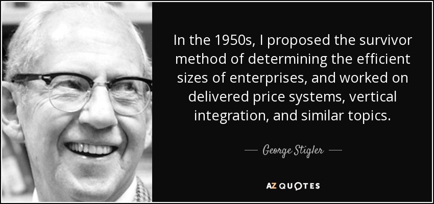 In the 1950s, I proposed the survivor method of determining the efficient sizes of enterprises, and worked on delivered price systems, vertical integration, and similar topics.