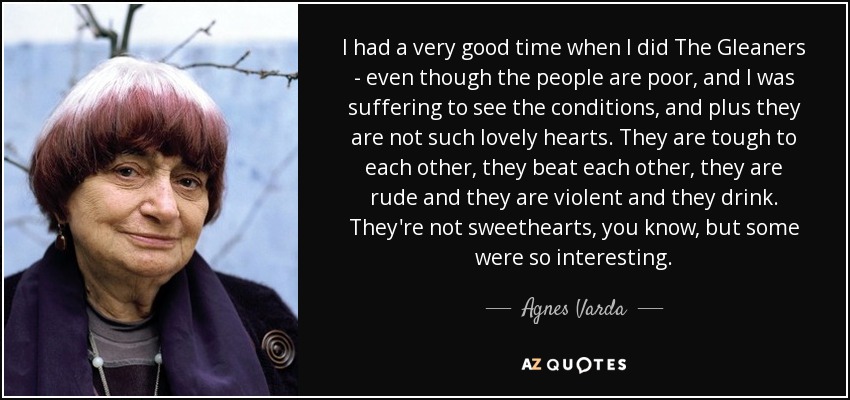 I had a very good time when I did The Gleaners - even though the people are poor, and I was suffering to see the conditions, and plus they are not such lovely hearts. They are tough to each other, they beat each other, they are rude and they are violent and they drink. They're not sweethearts, you know, but some were so interesting.