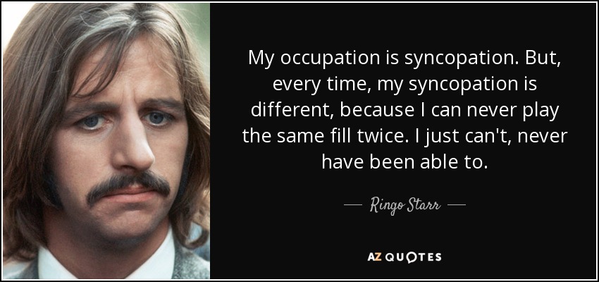Every time, my syncopation is different, because I can never play the same fill twice. I just can't, never have been able to. Even as a Beatle, they'd say, 'Oh, double-track that.' I don't know how you do that, because when I'm in a fill I'm sort of this blackout, just this pure me coming out and I can't pure me the same, twice. So, that's that.