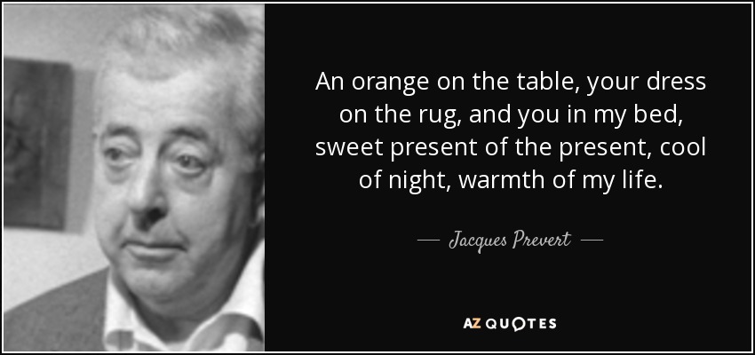 An orange on the table, your dress on the rug, and you in my bed, sweet present of the present, cool of night, warmth of my life.