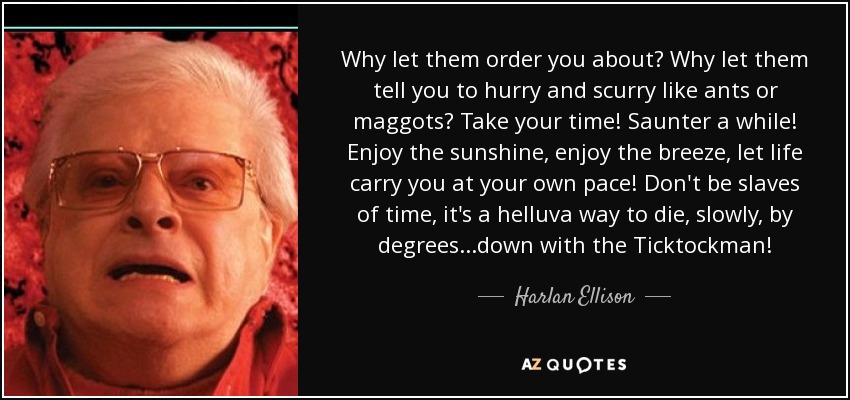 Why let them order you about? Why let them tell you to hurry and scurry like ants or maggots? Take your time! Saunter a while! Enjoy the sunshine, enjoy the breeze, let life carry you at your own pace! Don't be slaves of time, it's a helluva way to die, slowly, by degrees...down with the Ticktockman!