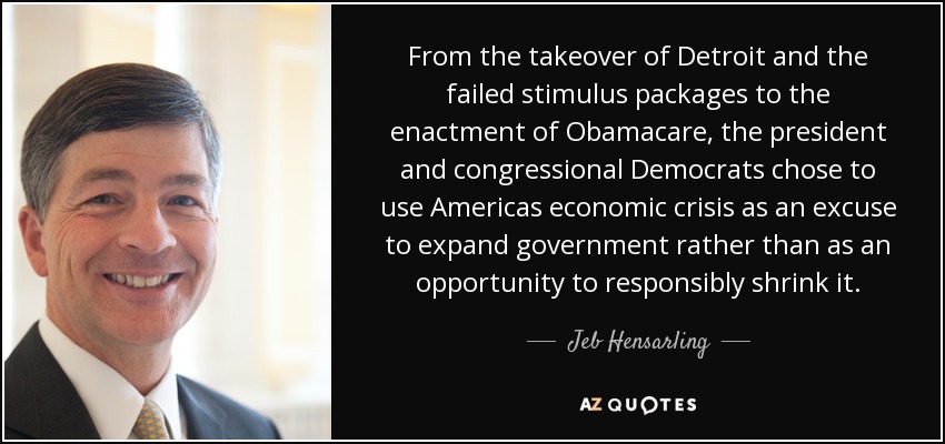 From the takeover of Detroit and the failed stimulus packages to the enactment of Obamacare, the president and congressional Democrats chose to use Americas economic crisis as an excuse to expand government rather than as an opportunity to responsibly shrink it.
