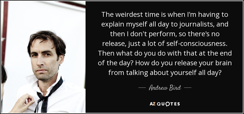 The weirdest time is when I'm having to explain myself all day to journalists, and then I don't perform, so there's no release, just a lot of self-consciousness. Then what do you do with that at the end of the day? How do you release your brain from talking about yourself all day?