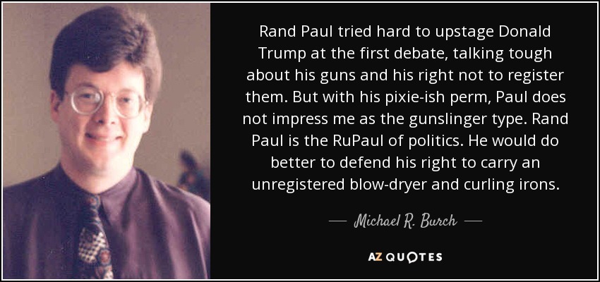Rand Paul tried hard to upstage Donald Trump at the first debate, talking tough about his guns and his right not to register them. But with his pixie-ish perm, Paul does not impress me as the gunslinger type. Rand Paul is the RuPaul of politics. He would do better to defend his right to carry an unregistered blow-dryer and curling irons.