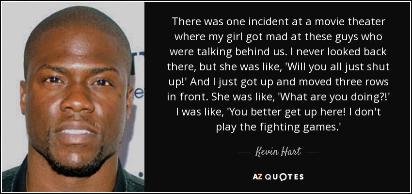 There was one incident at a movie theater where my girl got mad at these guys who were talking behind us. I never looked back there, but she was like, 'Will you all just shut up!' And I just got up and moved three rows in front. She was like, 'What are you doing?!' I was like, 'You better get up here! I don't play the fighting games.'