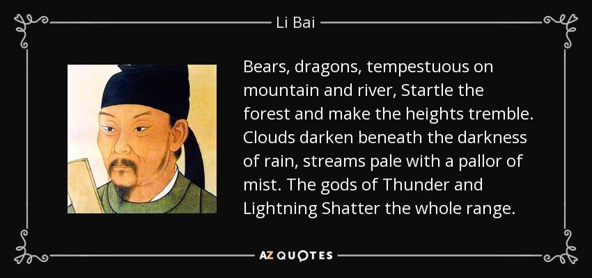 Bears, dragons, tempestuous on mountain and river, Startle the forest and make the heights tremble. Clouds darken beneath the darkness of rain, streams pale with a pallor of mist. The gods of Thunder and Lightning Shatter the whole range.