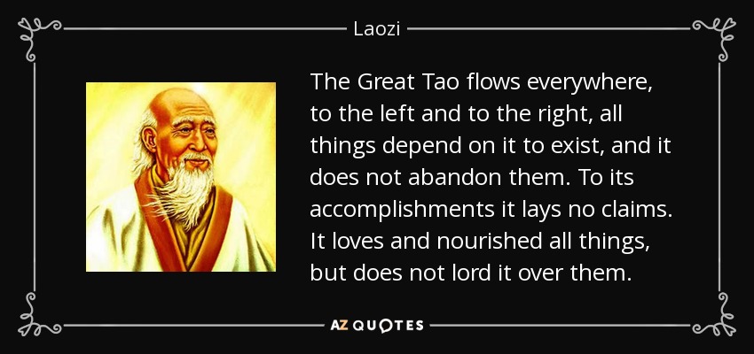 The Great Tao flows everywhere, to the left and to the right, all things depend on it to exist, and it does not abandon them. To its accomplishments it lays no claims. It loves and nourished all things, but does not lord it over them.