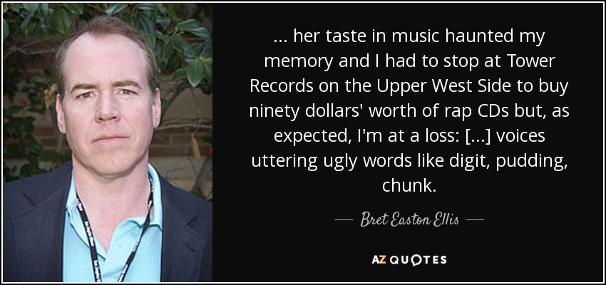 ... her taste in music haunted my memory and I had to stop at Tower Records on the Upper West Side to buy ninety dollars' worth of rap CDs but, as expected, I'm at a loss: [...] voices uttering ugly words like digit, pudding, chunk.