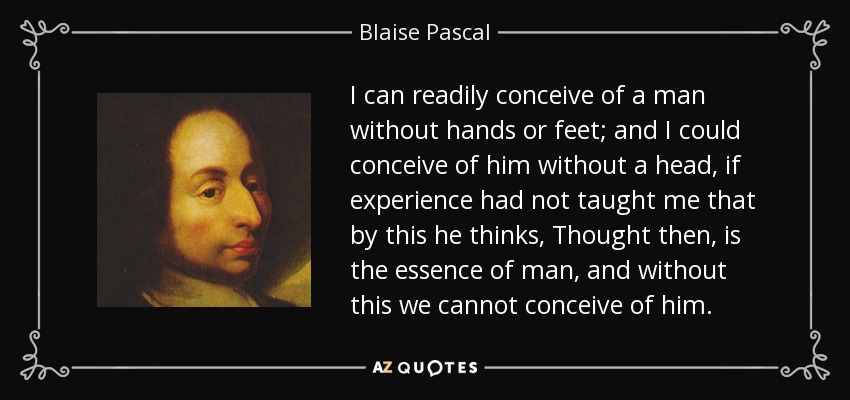 I can readily conceive of a man without hands or feet; and I could conceive of him without a head, if experience had not taught me that by this he thinks, Thought then, is the essence of man, and without this we cannot conceive of him.