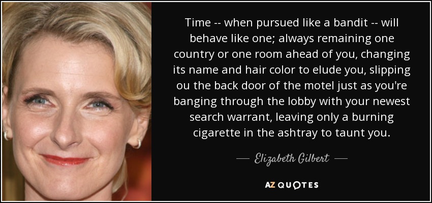 Time -- when pursued like a bandit -- will behave like one; always remaining one country or one room ahead of you, changing its name and hair color to elude you, slipping ou the back door of the motel just as you're banging through the lobby with your newest search warrant, leaving only a burning cigarette in the ashtray to taunt you.