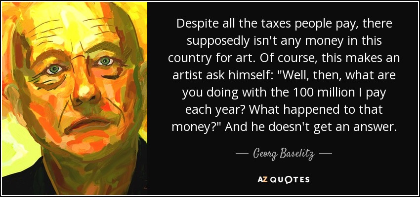 Despite all the taxes people pay, there supposedly isn't any money in this country for art. Of course, this makes an artist ask himself: "Well, then, what are you doing with the 100 million I pay each year? What happened to that money?" And he doesn't get an answer.
