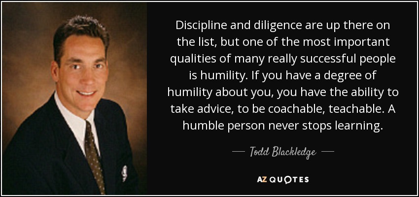 Discipline and diligence are up there on the list, but one of the most important qualities of many really successful people is humility. If you have a degree of humility about you, you have the ability to take advice, to be coachable, teachable. A humble person never stops learning.