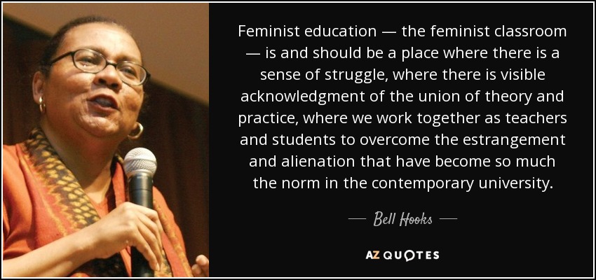 Feminist education — the feminist classroom — is and should be a place where there is a sense of struggle, where there is visible acknowledgment of the union of theory and practice, where we work together as teachers and students to overcome the estrangement and alienation that have become so much the norm in the contemporary university.