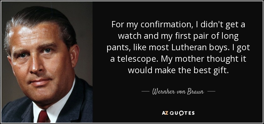 For my confirmation, I didn't get a watch and my first pair of long pants, like most Lutheran boys. I got a telescope. My mother thought it would make the best gift.