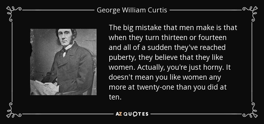 The big mistake that men make is that when they turn thirteen or fourteen and all of a sudden they've reached puberty, they believe that they like women. Actually, you're just horny. It doesn't mean you like women any more at twenty-one than you did at ten.