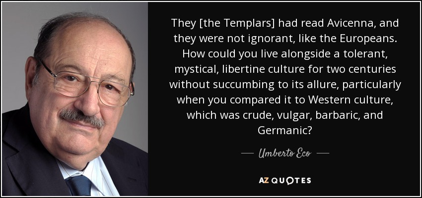 They [the Templars] had read Avicenna, and they were not ignorant, like the Europeans. How could you live alongside a tolerant, mystical, libertine culture for two centuries without succumbing to its allure, particularly when you compared it to Western culture, which was crude, vulgar, barbaric, and Germanic?