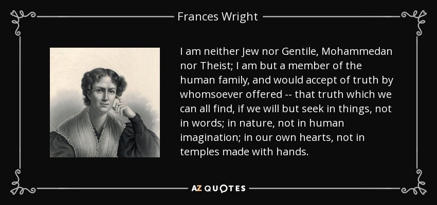 I am neither Jew nor Gentile, Mohammedan nor Theist; I am but a member of the human family, and would accept of truth by whomsoever offered -- that truth which we can all find, if we will but seek in things, not in words; in nature, not in human imagination; in our own hearts, not in temples made with hands.