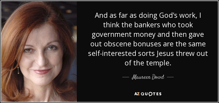 And as far as doing God's work, I think the bankers who took government money and then gave out obscene bonuses are the same self-interested sorts Jesus threw out of the temple.