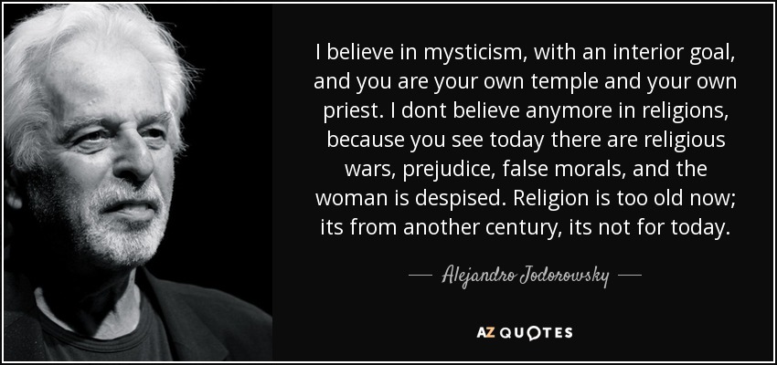 I believe in mysticism, with an interior goal, and you are your own temple and your own priest. I dont believe anymore in religions, because you see today there are religious wars, prejudice, false morals, and the woman is despised. Religion is too old now; its from another century, its not for today.