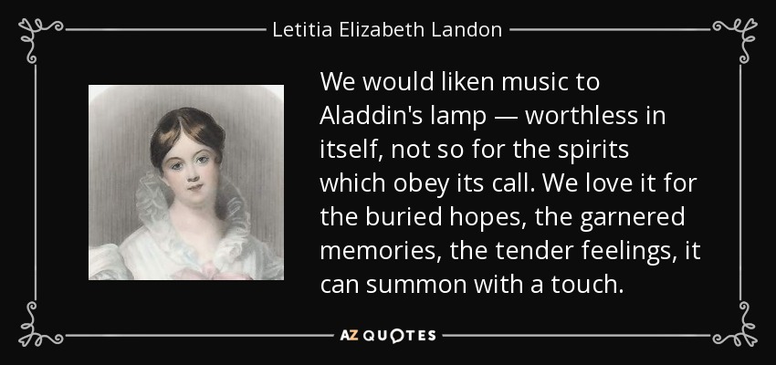 We would liken music to Aladdin's lamp — worthless in itself, not so for the spirits which obey its call. We love it for the buried hopes, the garnered memories, the tender feelings, it can summon with a touch.