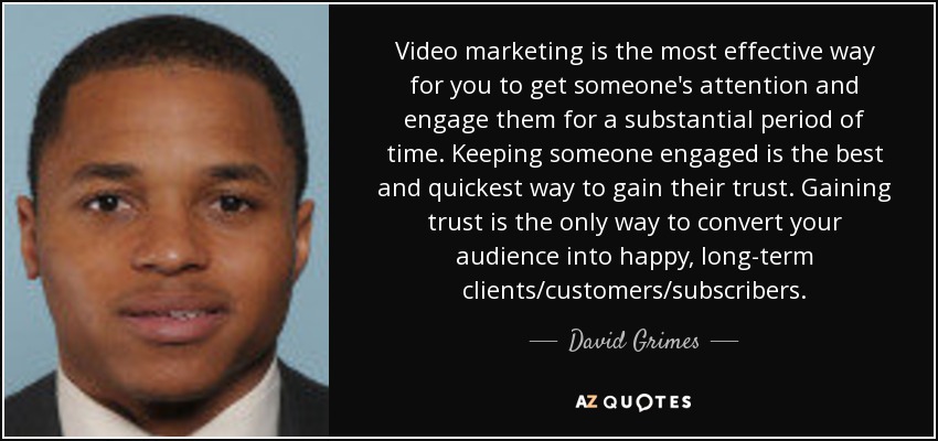 Video marketing is the most effective way for you to get someone's attention and engage them for a substantial period of time. Keeping someone engaged is the best and quickest way to gain their trust. Gaining trust is the only way to convert your audience into happy, long-term clients/customers/subscribers.