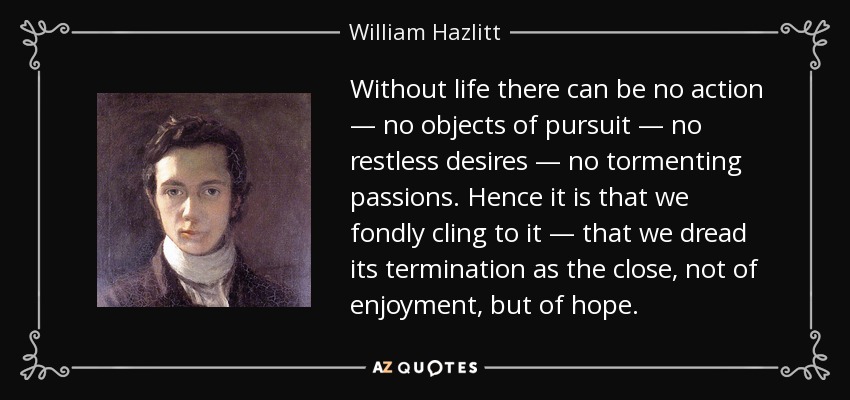 Without life there can be no action — no objects of pursuit — no restless desires — no tormenting passions. Hence it is that we fondly cling to it — that we dread its termination as the close, not of enjoyment, but of hope.