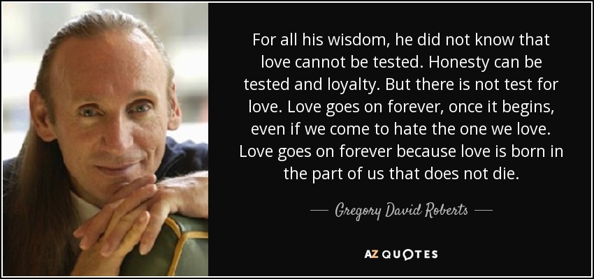 For all his wisdom, he did not know that love cannot be tested. Honesty can be tested and loyalty. But there is not test for love. Love goes on forever, once it begins, even if we come to hate the one we love. Love goes on forever because love is born in the part of us that does not die.