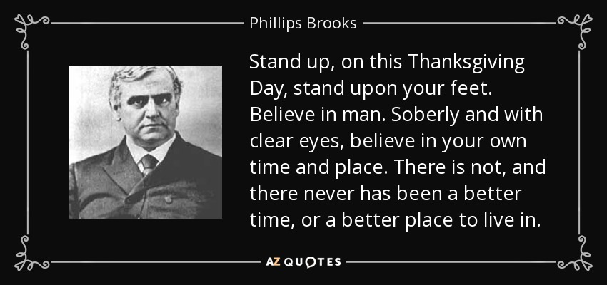 Stand up, on this Thanksgiving Day, stand upon your feet. Believe in man. Soberly and with clear eyes, believe in your own time and place. There is not, and there never has been a better time, or a better place to live in.
