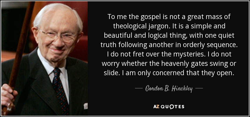 To me the gospel is not a great mass of theological jargon. It is a simple and beautiful and logical thing, with one quiet truth following another in orderly sequence. I do not fret over the mysteries. I do not worry whether the heavenly gates swing or slide. I am only concerned that they open.