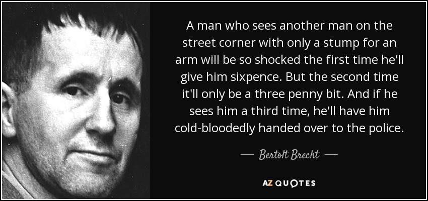 A man who sees another man on the street corner with only a stump for an arm will be so shocked the first time he'll give him sixpence. But the second time it'll only be a three penny bit. And if he sees him a third time, he'll have him cold-bloodedly handed over to the police.