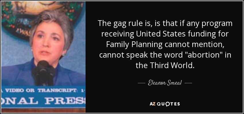 The gag rule is, is that if any program receiving United States funding for Family Planning cannot mention, cannot speak the word "abortion" in the Third World.