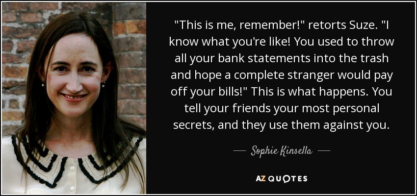 "This is me, remember!" retorts Suze. "I know what you're like! You used to throw all your bank statements into the trash and hope a complete stranger would pay off your bills!" This is what happens. You tell your friends your most personal secrets, and they use them against you.