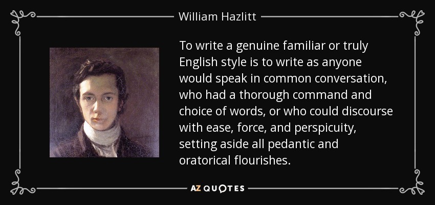 To write a genuine familiar or truly English style is to write as anyone would speak in common conversation, who had a thorough command and choice of words, or who could discourse with ease, force, and perspicuity, setting aside all pedantic and oratorical flourishes.